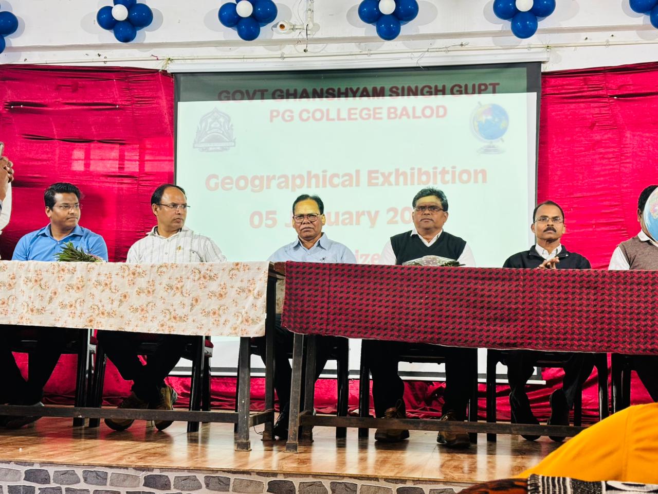 कार्यक्रम की अध्यक्षता भूगोल विभाग की विभाग अध्यक्ष प्रो एन खरे के द्वारा किया गय। कार्यक्रम में भूगोल के छात्र-छात्राओं के द्वारा जलवायु विज्ञान समुद्र विज्ञान भू आकृति विज्ञान इत्यादि विषयों से संबंधित मॉडल का प्रस्तुतीकरण किया गया। Geographical exhibition में छात्र-छात्राओं द्वारा प्रस्तुत मॉडल को दो श्रेणियां में विभाजित किया गया। इस कार्यक्रम में छात्र-छात्राओं के द्वारा प्रस्तुत मॉडल का कार्यक्रम के मुख्य अतिथि महाविद्यालय के प्राचार्य डॉ के के खलखो एवं अन्य विशिष्ट अतिथियों के द्वारा अवलोकन कर उनका उत्साह वर्धन किया गया। इस कार्यक्रम में छात्र-छात्राओं के मध्य भूगोल विषय से संबंधित प्रश्न मंच एवं ज्योग्राफिकल गेम्स का आयोजन किया गया।![]()