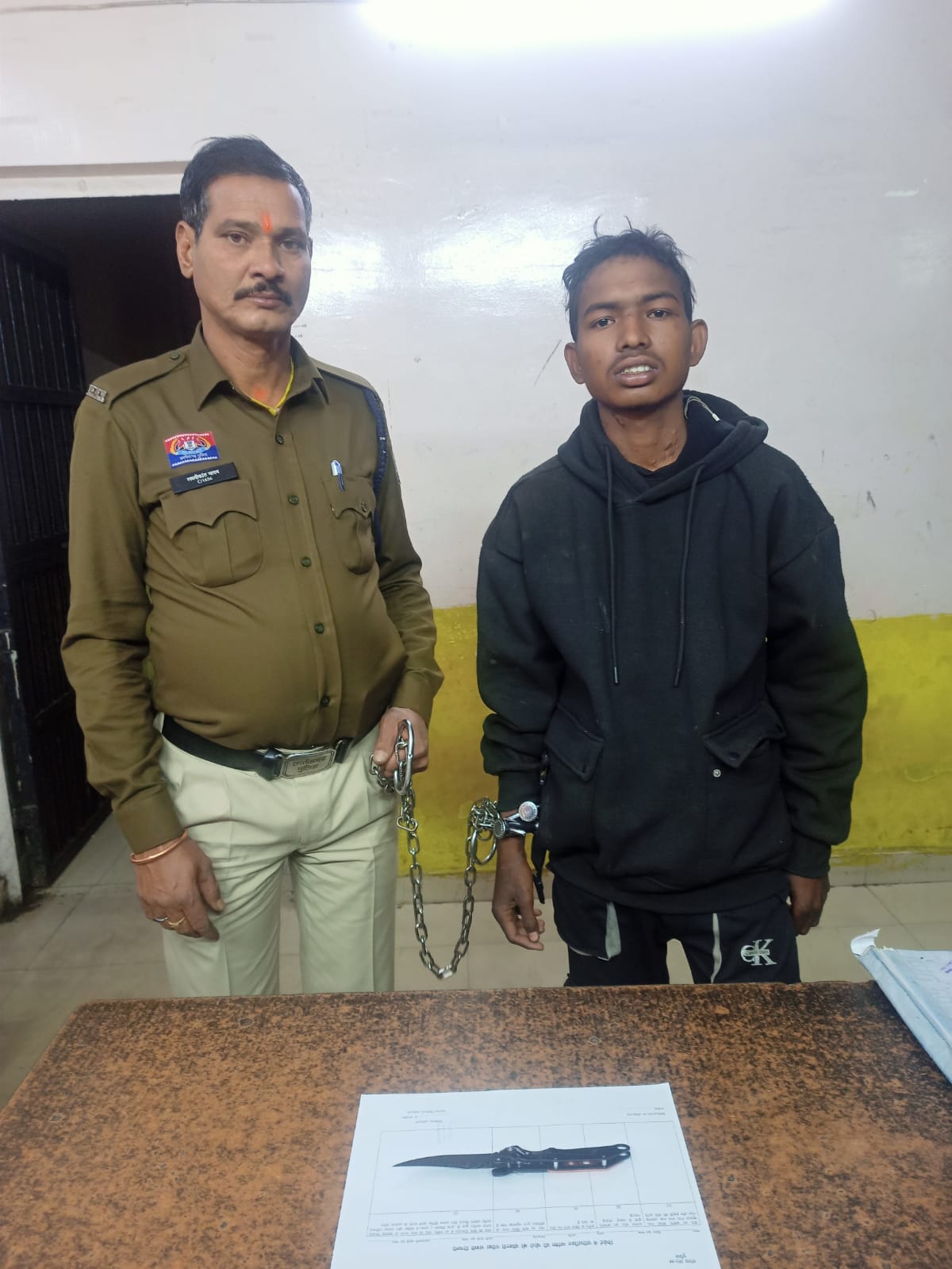 दिनांक 14.01.2026 को थाना खमतराई पुलिस को मुखबिर से सूचना मिला की ट्रांसपोर्ट नगर पर्किंग न.02 रावाभाठा में एक व्यक्ति अपने हाथ मे धारदार चाकू लेकर लहराते हुए आम लोगों को आतंकित कर रहा है कि सूचना पर घेराबंदी कर आरोपी को पकड़कर पूछताछ करने पर अपना नाम मन्नू सोनवानी पिता भोकलु सोनवानी 20 वर्ष निवासी आरटीओ कार्यलय के पास डेरापारा रावाभाठा बताए जिसे गिरफ्तार कर आरोपी के कब्जे से एक धारदार चाकू जप्त कर आरोपी के विरूद्ध थाना खमतराई में अपराध क्रमांक 30/26 धारा 25, 27 आर्म्स एक्ट का अपराध पंजीबद्ध कर कार्यवाही किया गया।