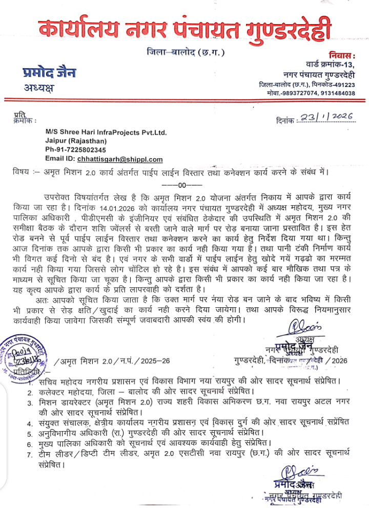 नगर पंचायत अध्यक्ष द्वारा इस संबंध में जिला कलेक्टर बालोद, मिशन डायरेक्टर (अमृत मिशन 2.0), और विभागीय उच्च अधिकारियों को लिखित पत्र भेजकर ठेकेदार की लापरवाही से अवगत करा दिया गया है। पत्र में स्पष्ट उल्लेख है कि ठेकेदार का यह कृत्य कार्य के प्रति घोर लापरवाही और जन-विरोधी रवैये को दर्शाता है।