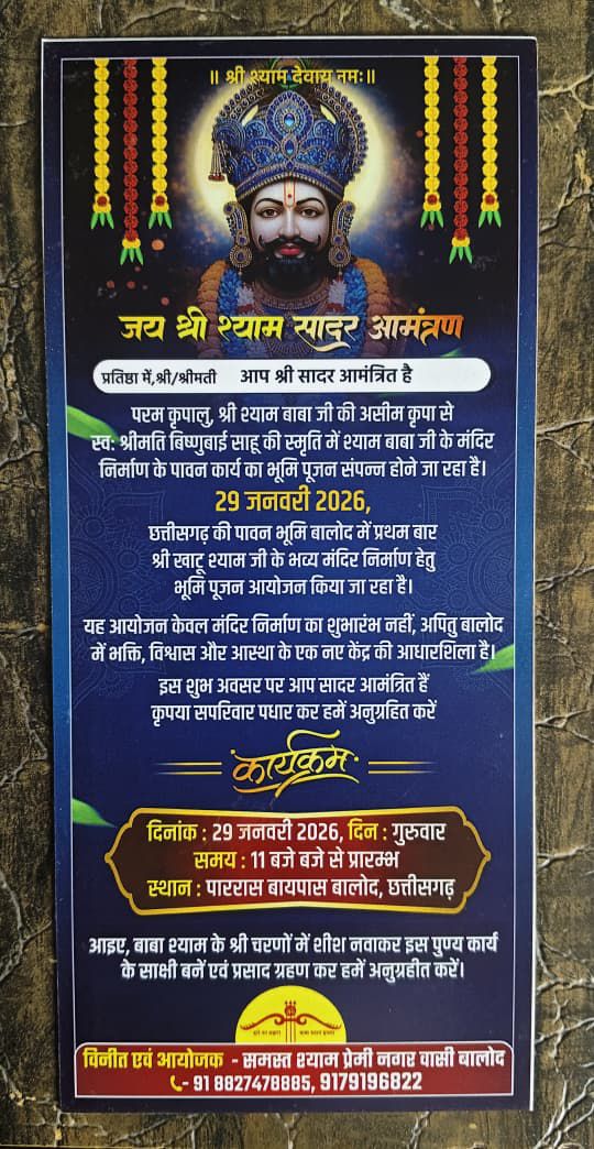 छत्तीसगढ़ की पावन धरती बालोद में श्रद्धा, भक्ति और आस्था का एक नया अध्याय जुड़ने जा रहा है। परम कृपालु श्री श्याम बाबा जी की असीम कृपा से स्वर्गीय श्रीमती बिसाहू सahu की स्मृति में श्री श्याम बाबा जी के भव्य मंदिर निर्माण का पावन कार्य प्रारंभ होने जा रहा है। इस ऐतिहासिक अवसर पर 29 जनवरी 2026, गुरुवार को मंदिर निर्माण हेतु भूमि पूजन कार्यक्रम का आयोजन किया जाएगा।