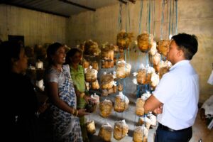 इस दौरान कलेक्टर चन्द्रवाल ने नवदीप स्व सहायता समूह कोटागांव की महिलाओं के द्वारा ठाकुर पारा कोटागांव में किए जा रहे मशरूम उत्पादन कार्य का भी अवलोकन किया।चन्द्रवाल ने स्व सहायता समूह की अध्यक्ष से मशरूम उत्पादन कार्य के संबंध में विस्तारपूर्वक जानकारी ली। इसके अंतर्गत उन्होेंने मशरूम उत्पादन कार्य में लगने वाली कुल लागत, इसकी बिक्री एवं आमदनी के संबंध में जानकारी ली।