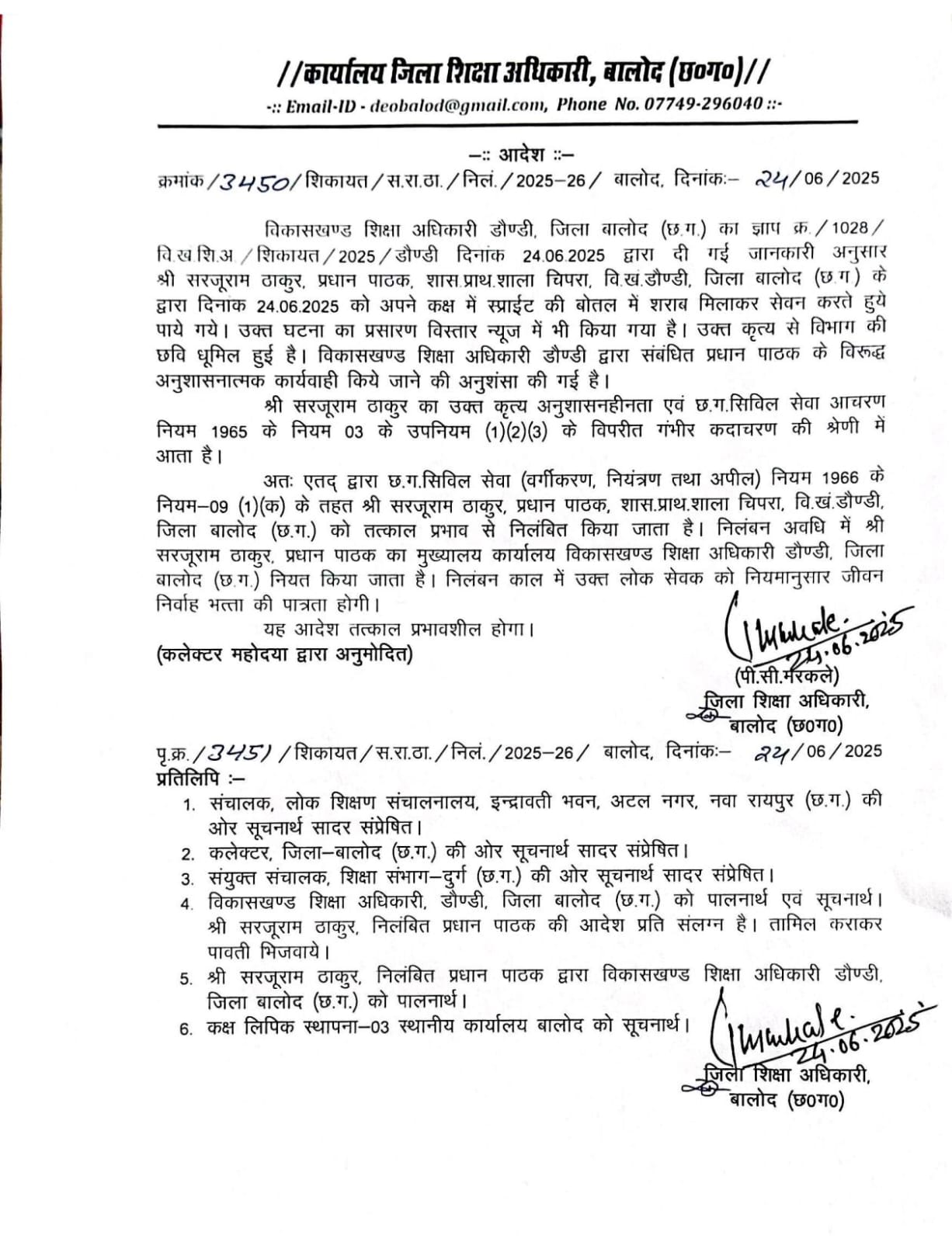जिला शिक्षा अधिकारी पीसी मरकले ने जिले के डौण्डी विकासखण्ड के शासकीय प्राथमिक शाला चिपरा के प्रधानपाठक सरजूराम ठाकुर को अपने कक्ष में स्प्राईट की बोतल में शराब मिलाकर सेवन करते हुये पाए जाने पर तत्काल प्रभाव से निलंबित कर दिया गया है। जिला शिक्षा अधिकारी पीसी मरकले ने बताया कि डौण्डी विकासखण्ड के शासकीय प्राथमिक शाला चिपरा के प्रधानपाठक सरजूराम ठाकुर के द्वारा 24 जून 2025 को अपने कक्ष में स्प्राईट की बोतल में शराब मिलाकर सेवन करते हुये पाए गए। उन्होंने बताया कि उक्त कृत्य से विभाग की छवि धूमिल हुई है। विकासखण्ड शिक्षा अधिकारी डौण्डी द्वारा संबंधित प्रधान पाठक के विरूद्ध अनुशासनात्मक कार्यवाही किये जाने की अनुशंसा की गई है।