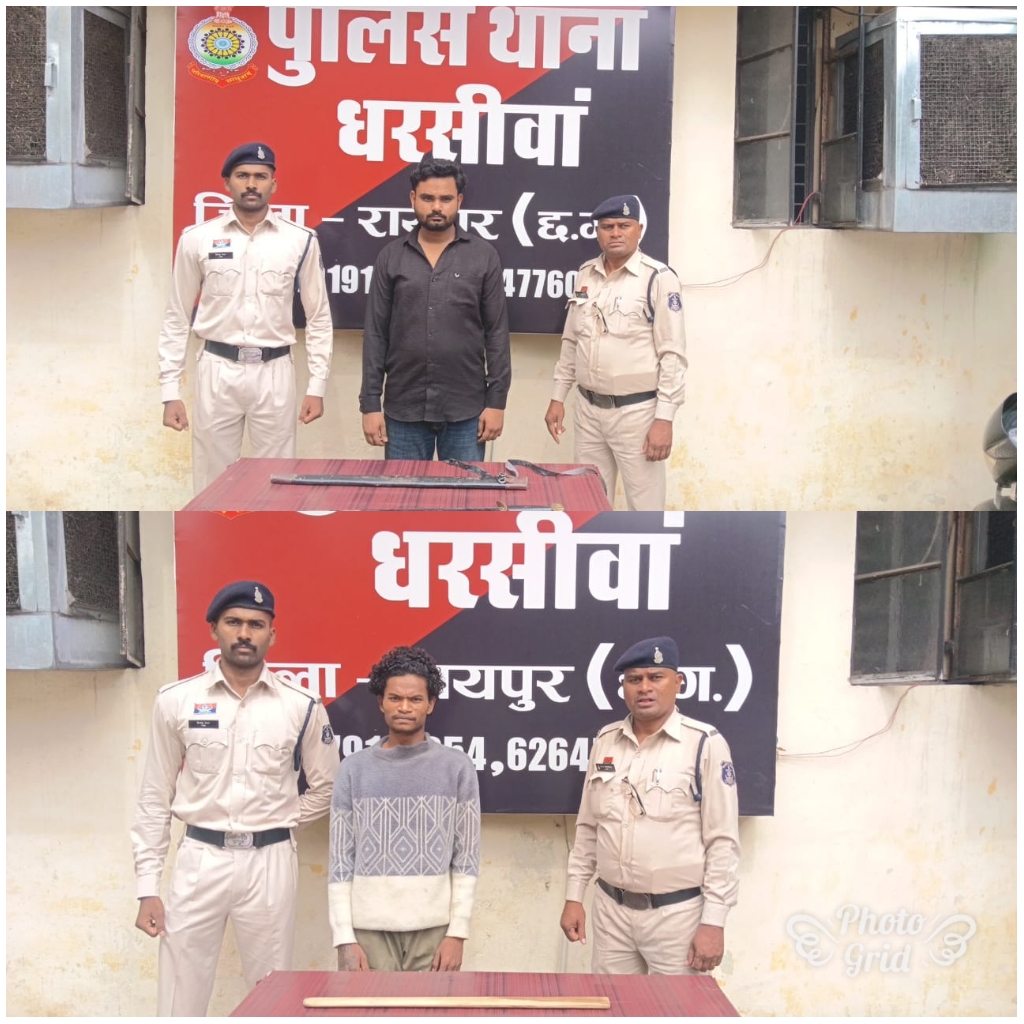 उसे आज नहीं छोड़ेंगे कह रहे है कि सूचना पर थाना प्रभारी राजेन्द्र दीवान एवं वरिष्ठ अधिकारियों के निर्देशानुसार तत्काल घटना स्थल पहुंचकर घेराबंदी कर आरोपी 01. सोनू धुर्वे पिता कलीराम धुर्वे उम्र 22 वर्ष पता थानखमरिया वार्ड नंबर 02 थाना थानखम्हरिया जिला बेमेतरा छत्तीसगढ़, 02. मोहम्मद सैफ पिता शेख गयामुद्दीन उम्र 25 साल पता थानखमरिया वार्ड नंबर 11 थाना थानखम्हरिया जिला बेमेतरा छत्तीसगढ़ के कब्जे से एक-एक लोहे का धारदार नुकिला तलवार तथा तलवार का म्यान को जप्त कर आरोपियों के विरूद्ध थाना धरसीवां में अपराध क्र. 326/2025 एवं अपराध क्र. 327/2025 धारा 25, 27 आर्म्स एक्ट के तहत अपराध दर्ज कर विधिवत दिनांक 10.07.2025 को गिरफ्तार कर जुडिश्यिल रिमांड पर भेजा गया।
