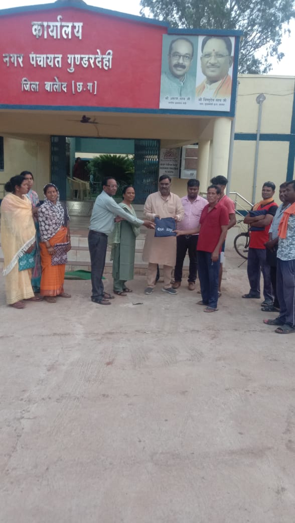नगर पंचायत गुंडरदेही में आज नगर पंचायत अध्यक्ष प्रमोद जैन जी के द्वारा सफाई कर्मचारियों को रेंटकॉट ओर छाता वितरित किया गया। इस मौके पर सीएमओ किरण पटेल,सब इंजीनियर रूपेश सिंह राठिया,लेखा अधिकारी श्रवण निर्मलकर,छम्मन साहू ,