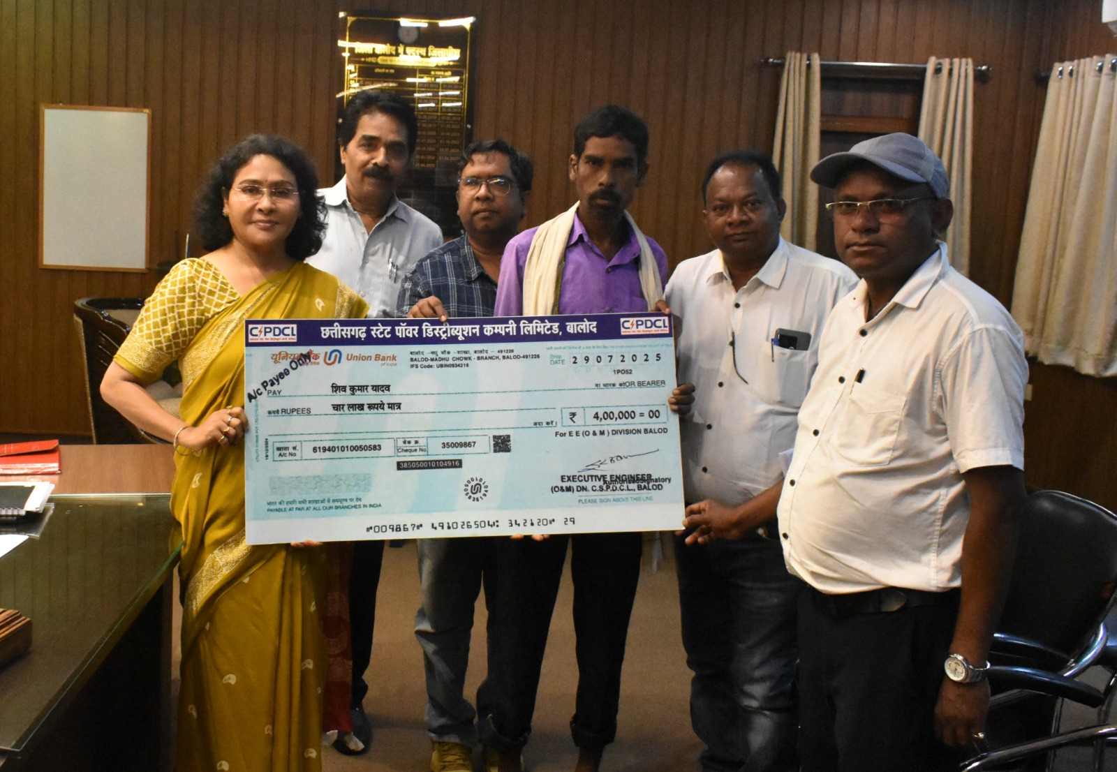 विवाह कार्यक्रम के दौरान समारोह में लगाए गए टेंट में बिजली प्रवाहित होने पर वह टेंट में लगे लोहे के संपर्क में आने से फलेश्वर यादव की मृत्यु हो गयी थी। इस घटना के लिए छत्तीसगढ़ राज्य विद्युत वितरण कंपनी व राज्य सरकार द्वारा मुआवजे के प्रावधान के अनुसार मृतक के उत्तराधिकारी पिता शिवकुमार यादव को चेक के माध्यम से 04 लाख रूपये का मुआवजा राशि प्रदान किया गया है।