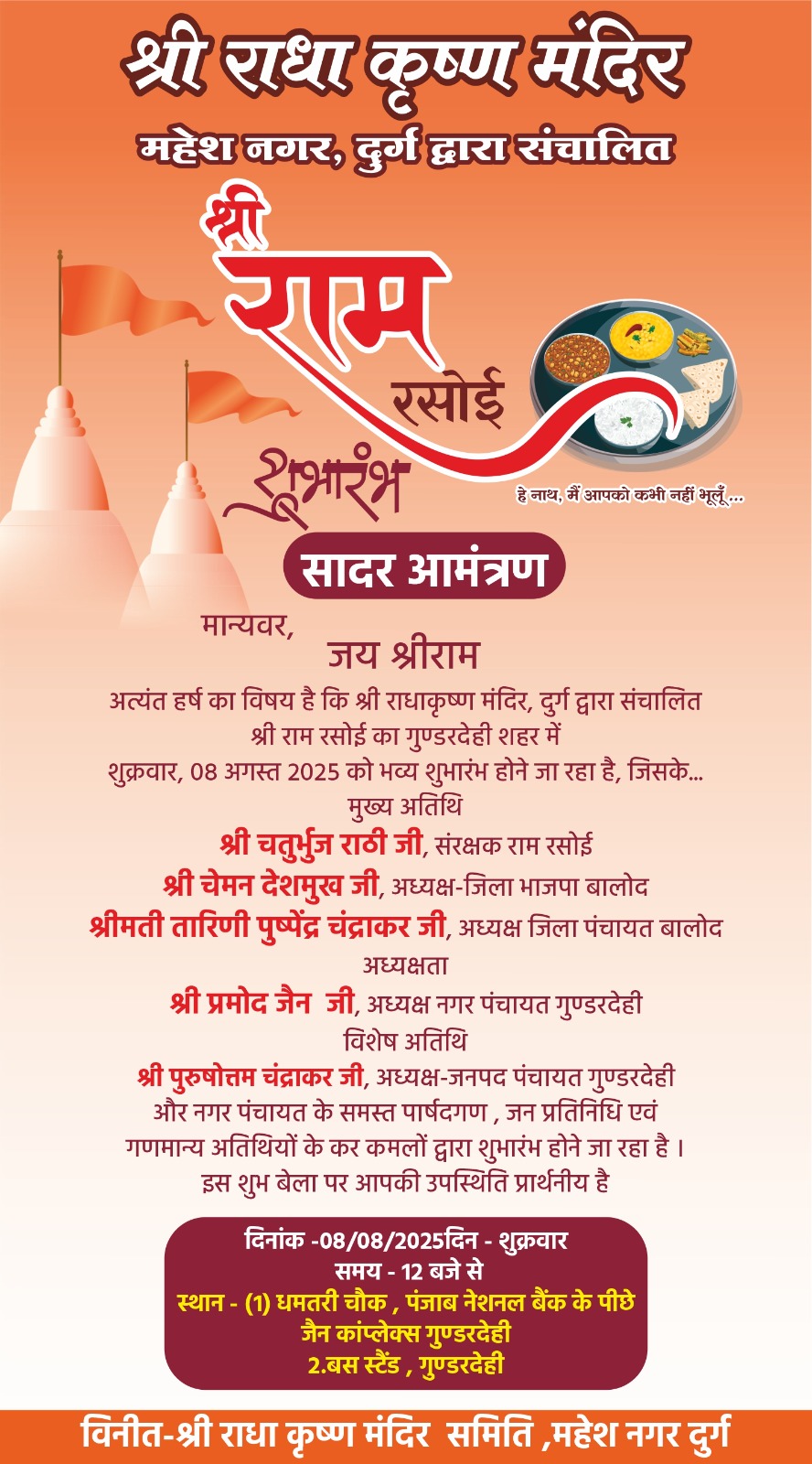 यह रसोई प्रतिदिन दोपहर 12 बजे से 3 बजे तक संचालित होगी और रविवार को अवकाश रहेगा। इस पुनीत कार्य का उद्देश्य सभी को पौष्टिक और स्वच्छ भोजन उपलब्ध कराना है। इस शुभ अवसर पर सभी की उपस्थिति सादर प्रार्थनीय है।