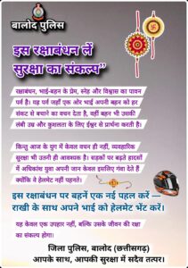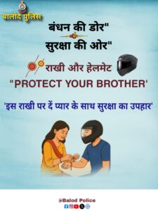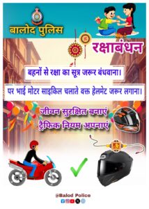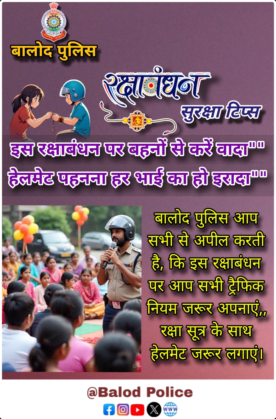 पुलिस अधीक्षक योगेश पटेल के निर्देशन में अतिरिक्त पुलिस अधीक्षक मोनिका ठाकुर एवं एसडीओपी देवांश सिंह राठौर के मार्गदर्शन में बालोद पुलिस द्वारा रक्षाबंधन पर्व के अवसर पर अप्रिय दुर्घटनाओं की रोकथाम एवं दुरुस्त ट्रैफिक व्यवस्था के साथ समस्त नागरिकों को विशेष अपील करती है कि सड़क सुरक्षा यातायात नियमों का अक्षरशः पालन करें जिससे आपका जीवन सुरक्षित रहे।