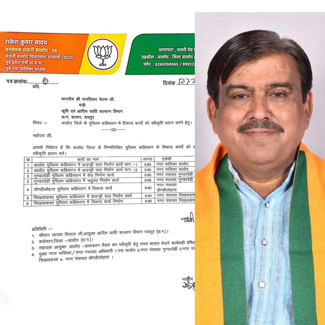 बालोद भारतीय जनता पार्टी के पूर्व प्रदेश मंत्री एवं संजारी बालोद के जनसेवक राकेश यादव ने छत्तीसगढ़ शासन के कैबिनेट मंत्री रामविचार नेताम को मांग पत्र लिखकर बालोद जिले के बालोद गुंडरदेही चिखलाकसा डौंडीलोहारा के मुस्लिम कब्रिस्तान में अहाता निर्माण हेतु राशि स्वीकृत करने की मांग की है मांग पत्र के संदर्भ में भाजपा नेता राकेश यादव ने बताया कि लगातार मुस्लिम समुदाय के लोग गत कई वर्षों से अपने कब्रिस्तान में अहाता निर्माण की मांग कर रहे हैं।