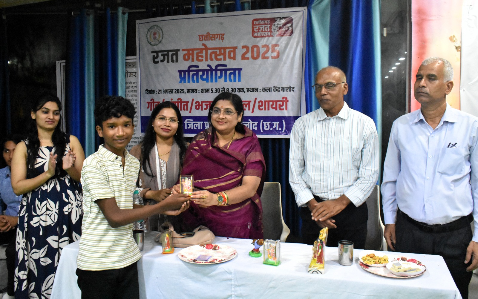 छत्तीसगढ़ रजत महोत्सव के उपलक्ष्य में जिला मुख्यालय बालोद स्थित कला केंद्र में एक शानदार संगीत प्रतियोगिता का आयोजन किया गया। इस कार्यक्रम में विभिन्न प्रतिभागियों ने गायन, बांसुरी वादन और वायलिन जैसे क्षेत्रों में अपनी उत्कृष्ट प्रतिभा का प्रदर्शन किया, जिसने उपस्थित दर्शकों को मंत्रमुग्ध कर दिया। प्रतियोगिता में स्थानीय प्रतिभागियों ने अपनी कला के माध्यम से छत्तीसगढ़ की सांस्कृतिक समृद्धि को दर्शाया।