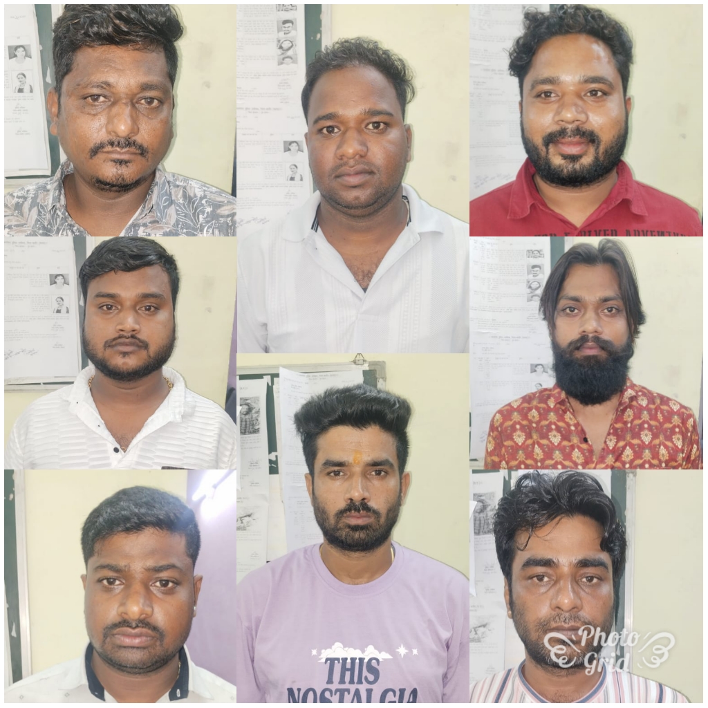 बालोद//दिनांक 24.08.2025 को टाउन पेट्रोलिंग, अभियान कार्यवाही के दौरान मुखबीर से सूचना मिला कि कुछ जुवाड़ियान ग्राम डगनिया ग्रीन के कोया फार्म प्लाट न. 10 के लान में 52 पत्ती ताश से रूपये पैसे का हारजीत का दांव लगाकर काट पत्ती नामक जुआ खेल रहे है। सूचना पर वरिष्ठ अधिकारियो को सूचना से अवगत कराकर थाना गुण्डरदेही से टीम गठित कर गवाहो के समक्ष घेराबंदी कर जुआडियान 01. मोहम्मद फहीम पिता मोहम्मद सलील उम्र 38 साल निवासी गंजपारा दुर्ग 02. प्रमोद निवारे पिता रूखमन निवारे उम्र 37 साल निवासी चंगोराभांठा, टिकरापारा रायपुर 03. रोशन पिता रमेश कृपलानी उम्र 34 साल निवासी इंद्रप्रस्थ कालोनी रायपुर 04. अनिकेत लक्ष्यवाणी पिता स्व. बसंत उम्र 27 साल निवासी रतन कालोनी, दानीटोला, धमतरी 05. राजीव तिवारी पिता स्व. रामनरेश तिवारी उम्र 34 साल निवासी शक्ति बाजार रायपुर 06. केवलदास भारती पिता लक्ष्मीनारायण उम्र 30 साल निवासी कमल विहार रायपुर 07. नागेश्वर साहू पिता जुराखन साहू उम्र 29 साल निवासी कांदूल, मौदहापारा रायपुर 08. ओमप्रकाश चंद्रा पिता नेगीलाल चंद्रा उम्र 32 साल निवासी देवसागर भटगांव सारंगगढ़-बिलाईगढ़ 09. जितेन्द्र सिंधी पिता रमेश उम्र 32 साल निवासी इंद्रप्रस्थ मस्जिद के पास रायपुर