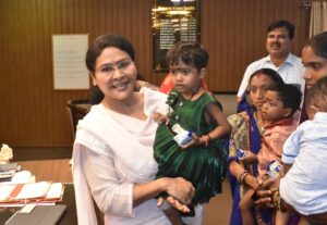 कलेक्टर दिव्या उमेश मिश्रा ने जिले में चलाए जा रहे कुपोषण मुक्ति अभियान के अंतर्गत बालोद विकासखण्ड के ग्राम चिचबोड़ की हिमांशी एवं ग्राम परसोदा की कुमारी तेजस्वी सहित दो कुपोषित बच्चों को गोद लेकर इन दोनों बच्चों को सुपोषण की श्रेणी में लाने हेतु समुचित देखभाल करने की जिम्मेदारी ली। कलेक्टर मिश्रा ने आज संयुक्त जिला कार्यालय स्थित अपने कक्ष में कुपोषित बच्चों एवं उनके परिजनों से भेंट किया।
