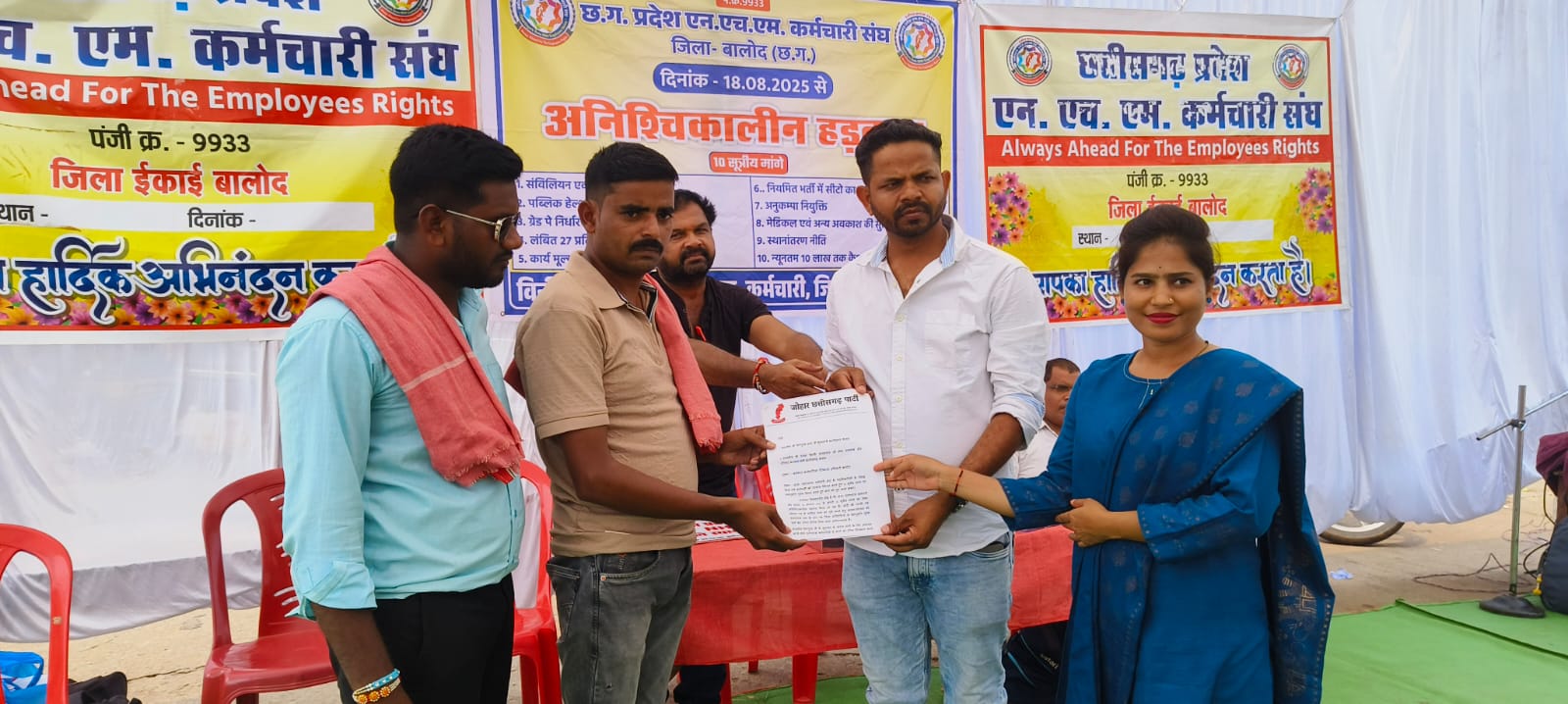जोहार छत्तीसगढ़ पार्टी ने ज्ञापन सौंपकर कहा कि छ.ग. एनएचएम कर्मचारी संघ द्वारा 18 अगस्त 2025 से अपनी 10 सूत्रीय मांगो को लेकर अनिश्चितकालीन हड़ताल किया जा रहा है। मोदी की गारंटी एवं घोषणा पत्र में शामिल मांग को पूर्ण करने हेतु शासन-प्रशासन को एनएचएम संघ के प्रांत एवं जिला प्रतिनिधियों से सहानुभूति पूर्वक चर्चा कर उचित निर्णय लिया जाना अतिआवश्यक हैं।