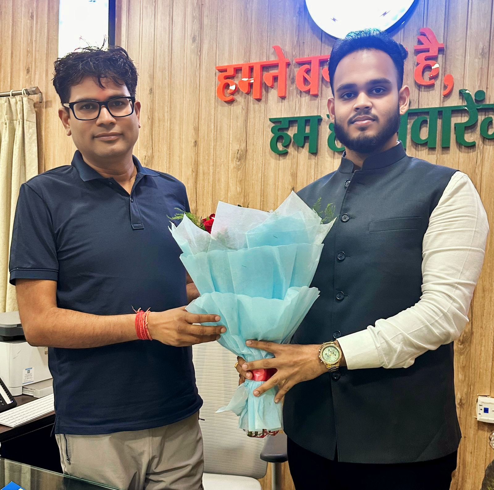 भाजपा युवा नेता एवं हिन्द सेना समाजसेवी संगठन युवा ब्रिगेड राष्ट्रीय अध्यक्ष दक्ष वैद्य साहू ने छत्तीसगढ़ शासन के वित्त मंत्री ओपी चौधरी से सौजन्य भेंट की। दक्ष वैद्य साहू ने इस अवसर पर वित्त मंत्री को पुष्पगुच्छ भेंट कर सम्मानित किया एवं राज्य के सर्वांगीण विकास पर चर्चा की।
